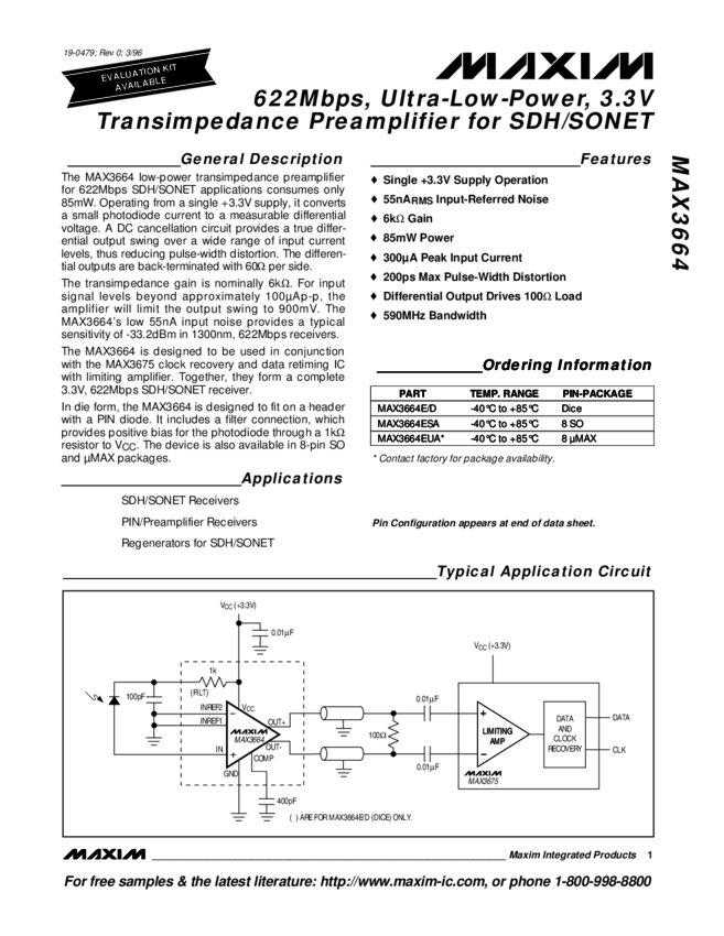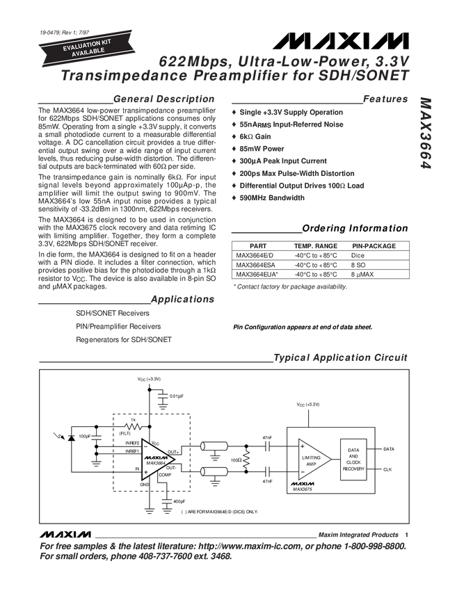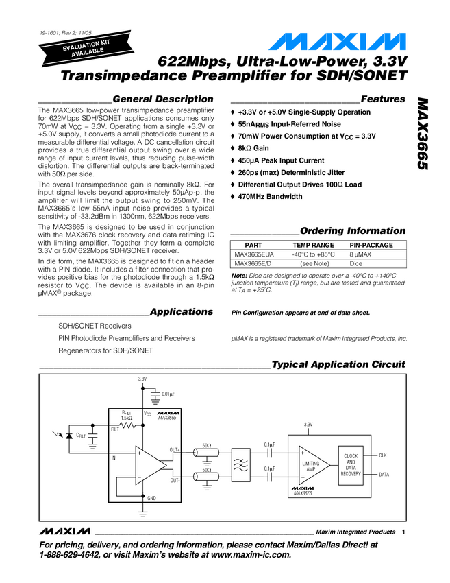 622Mbps, Ultra-Low-Power, 3.3V Transimpedance Preamplifier for SDH/SONET