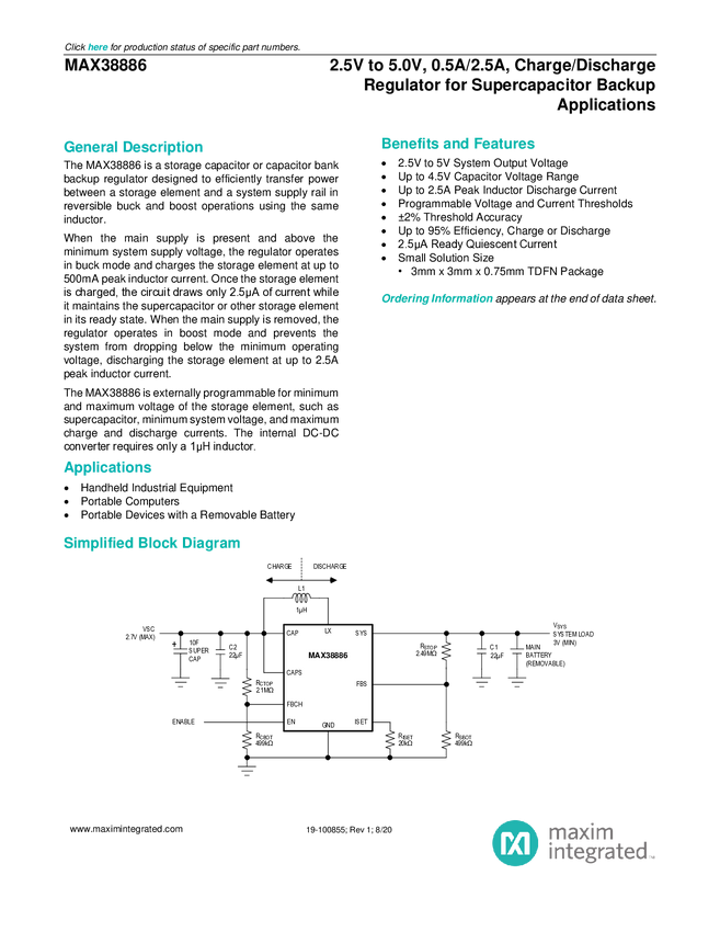 2.5V to 5.0V, 0.5A/2.5A, Charge/Discharge Regulator for Supercapacitor Backup Applications
