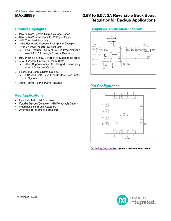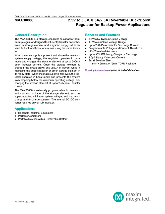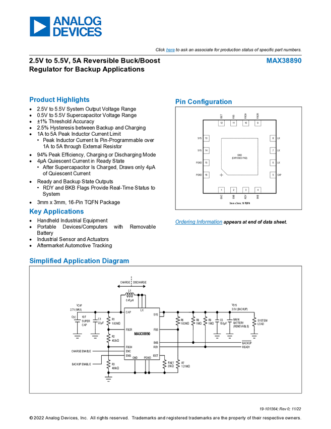 2.5V to 5.5V, 5A Reversible Buck/Boost Regulator for Backup Applications