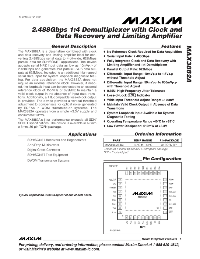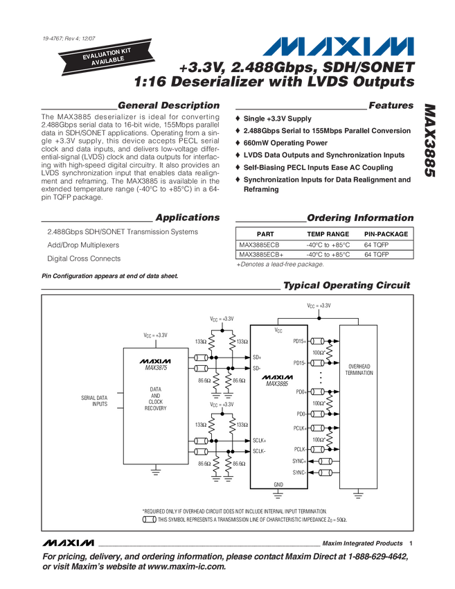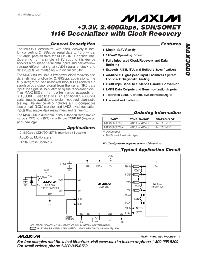 +3.3V, 2.488Gbps, SDH/SONET 1:16 Deserializer with LVDS Outputs