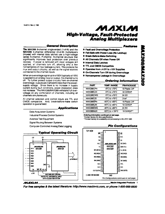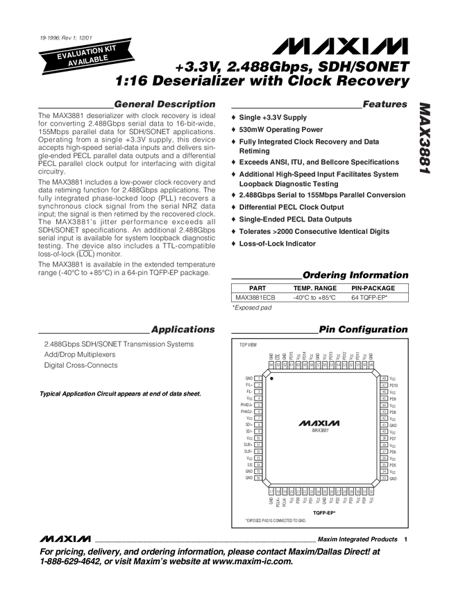 +3.3V, 2.488Gbps, SDH/SONET 1:16 Deserializer with Clock Recovery