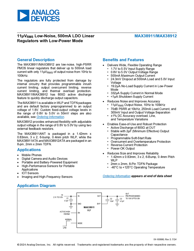 11µV Low-Noise, 500mA LDO Linear Regulators with Low-Power Mode
