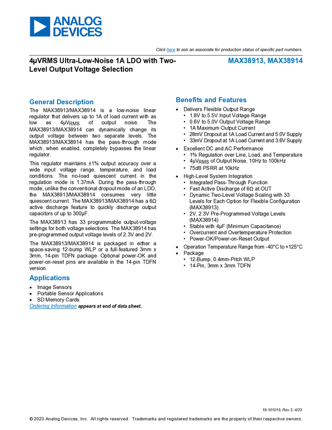 4µV Ultra-Low-Noise 1A LDO with Two-Level Output-Voltage Selection