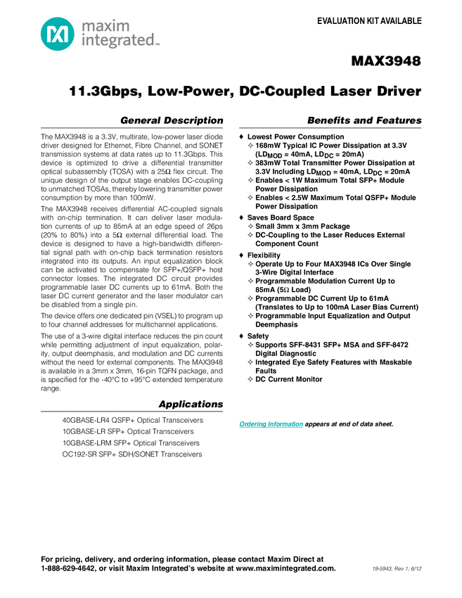MAX3948 11.3Gbps, Low-Power, DC-Coupled Laser Driver