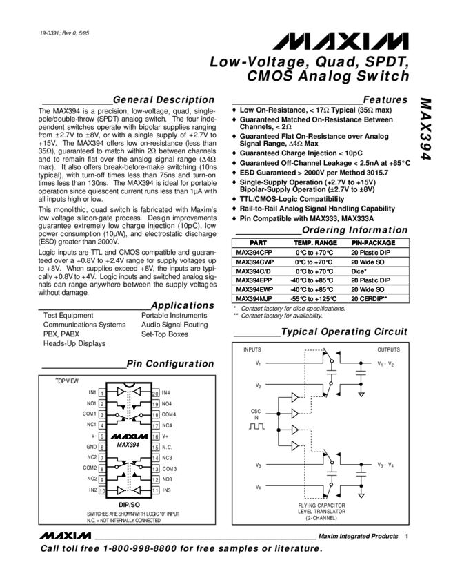 MAX394 Low-Voltage, Quad, SPDT, CMOS Analog Switch&#151Replaces MAX333A