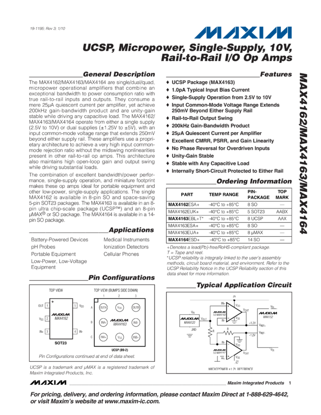 MAX4162, MAX4163, MAX4163EBL, MAX4164 SOT23, Micropower, Single-Supply, Rail-to-Rail I/O Op Amps