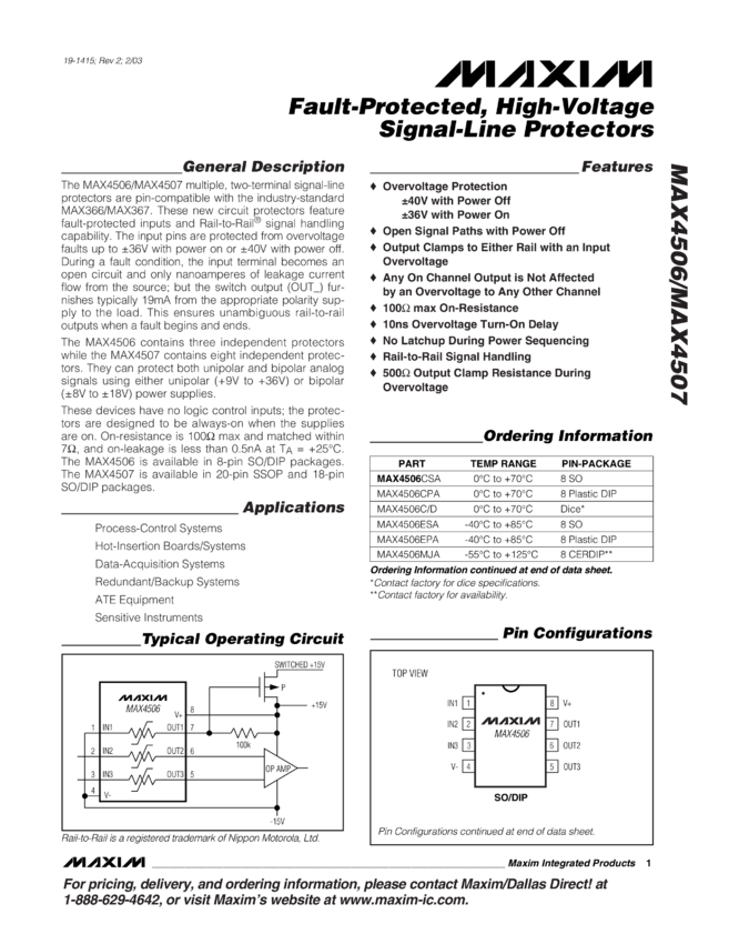MAX4506, MAX4507 Fault-Protected, High-Voltage Signal-Line Protectors