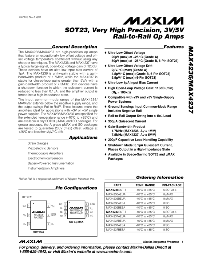 MAX4236, MAX4237 SOT23, Very High Precision, 3V/5V Rail-to-Rail Op Amps
