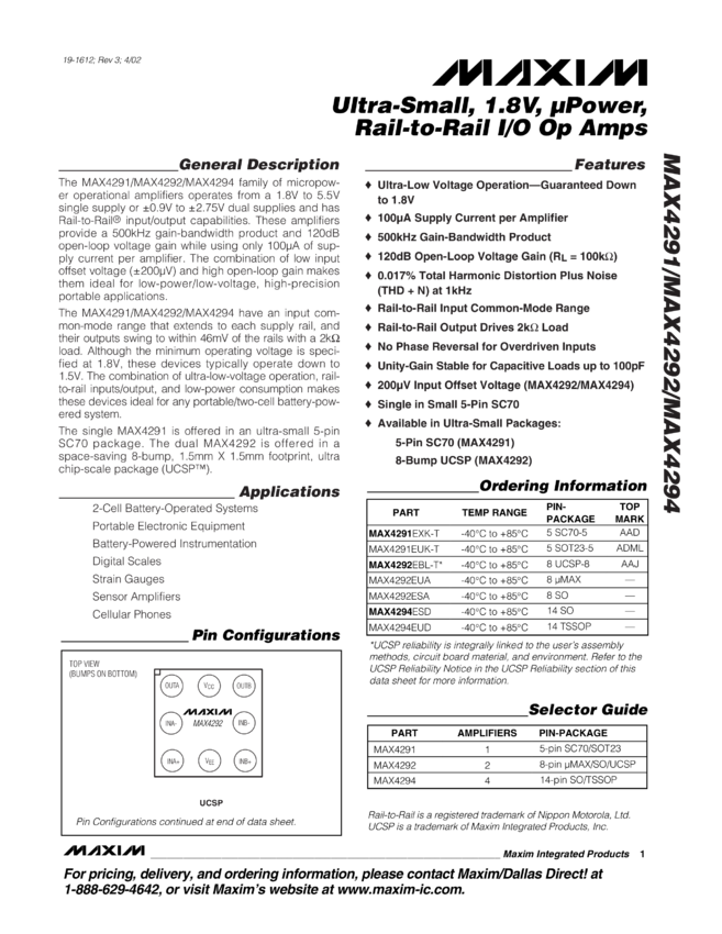 MAX4291, MAX4292, MAX4294 Ultra-Small, +1.8V, µPower, Rail-to-Rail I/O Op Amps