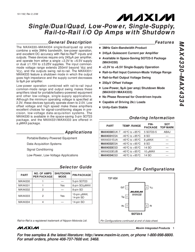 MAX4330, MAX4331, MAX4332, MAX4333, MAX4334 Single/Dual/Quad, Low-Power, Single-Supply, Rail-to-Rail I/O Op Amps with Shutdown
