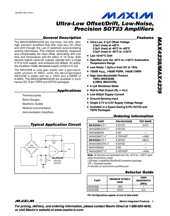 MAX4238, MAX4239 Ultra-Low Offset/Drift, Low-Noise, Precision SOT23 Amplifiers