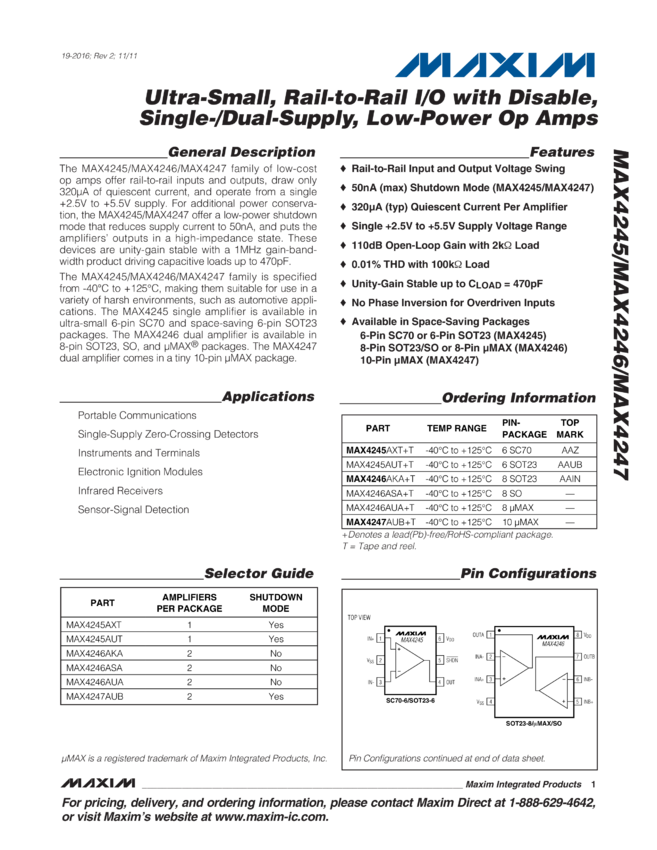 MAX4245, MAX4246, MAX4247 Ultra-Small, Rail-to-Rail I/O with Disable, Single/Dual-Supply, Low-Power Op Amps