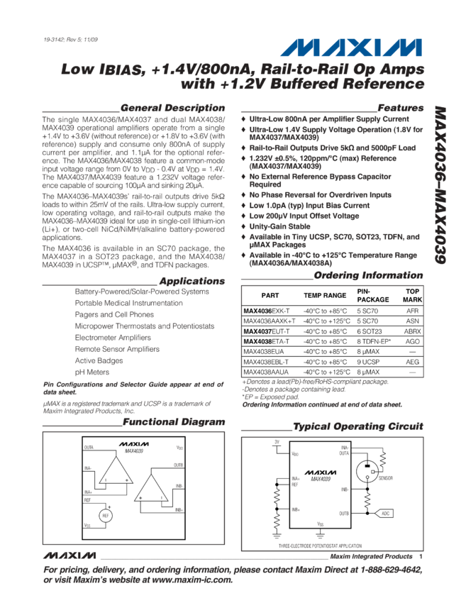 MAX4036, MAX4037, MAX4038, MAX4039 Low IBIAS, +1.4V/800nA, Rail-to-Rail Op Amps with +1.2V Buffered Reference