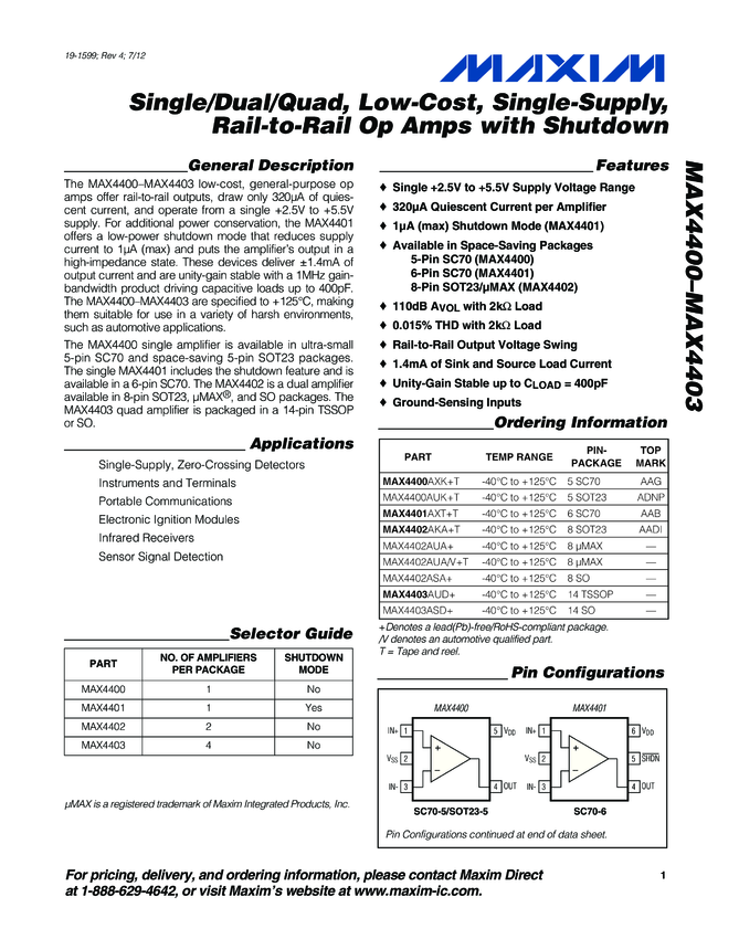 MAX4400, MAX4401, MAX4402, MAX4403 Single/Dual/Quad, Low-Cost, Single-Supply, Rail-to-Rail Op Amps with Shutdown