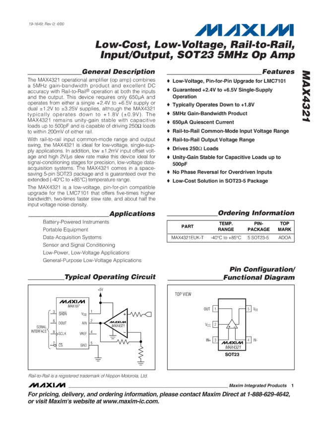 MAX4321 Low-Cost, Low-Voltage, Rail-to-Rail, Input/Output, SOT23 5MHz Op Amp