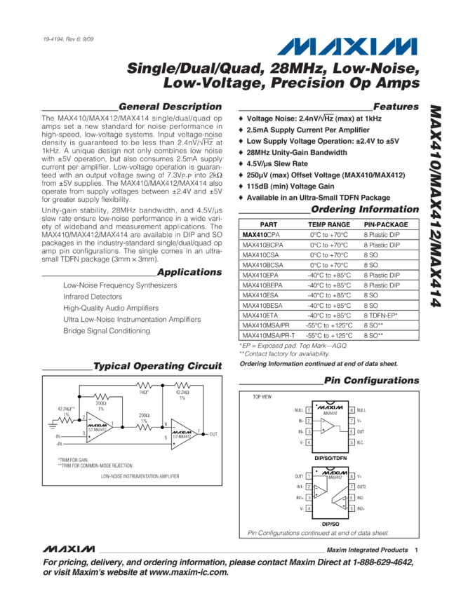 MAX410, MAX412, MAX414 Single/Dual/Quad, 28MHz, Low-Noise, Low-Voltage, Precision Op Amps