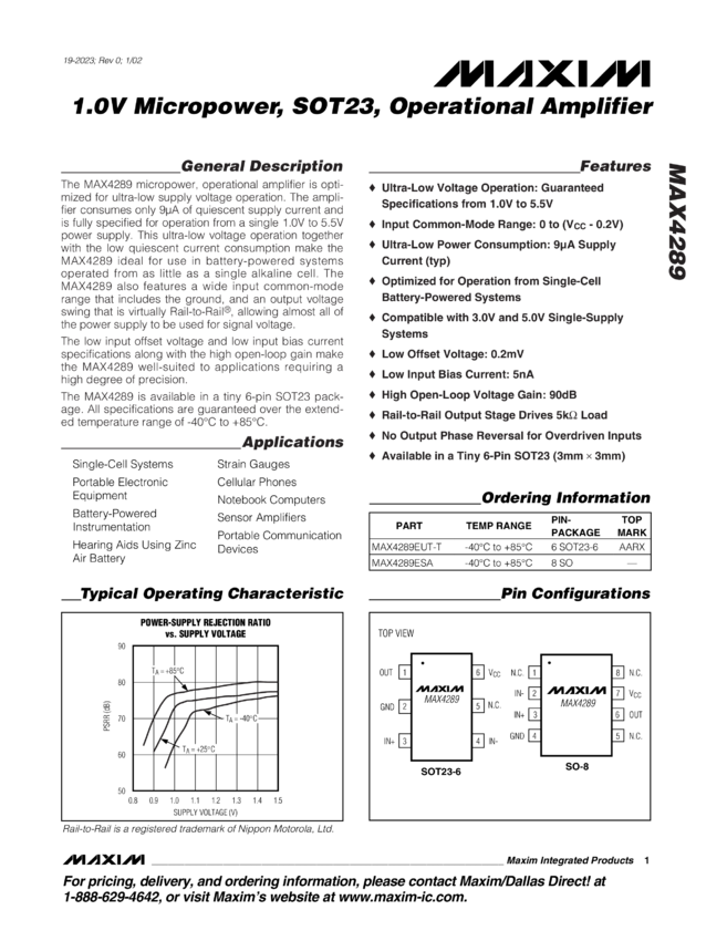 MAX4289 1.0V Micropower, SOT23, Operational Amplifier