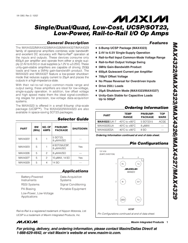 MAX4322, MAX4323, MAX4326, MAX4327, MAX4329 Single/Dual/Quad, Low-Cost, UCSP/SOT23, Low-Power, Rail-to-Rail I/O Op Amps