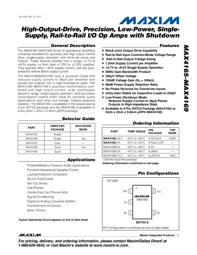 MAX4165, MAX4166, MAX4167, MAX4168, MAX4169 High-Output-Drive, Precision, Low-Power, Single-Supply, Rail-to-Rail I/O Op Amps with Shutdown