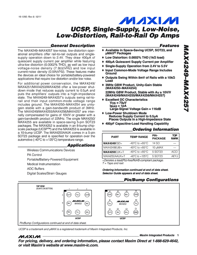 MAX4249, MAX4250, MAX4251, MAX4252, MAX4253, MAX4254, MAX4255, MAX4256, MAX4257 UCSP, Single-Supply, Low-Noise, Low-Distortion, Rail-to-Rail Op Amps