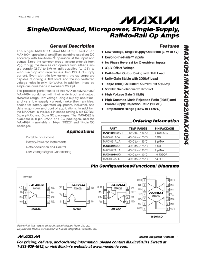 MAX4091, MAX4092, MAX4094 Single/Dual/Quad, Micropower, Single-Supply, Rail-to-Rail Op Amps