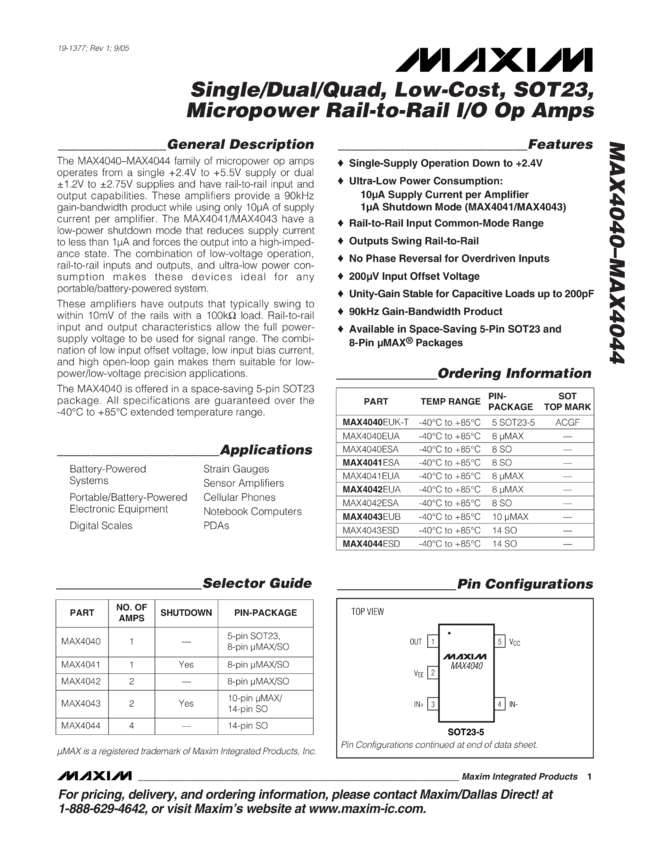 MAX4040, MAX4041, MAX4042, MAX4043, MAX4044 Single/Dual/Quad, Low-Cost, SOT23, Micropower Rail-to-Rail I/O Op Amps