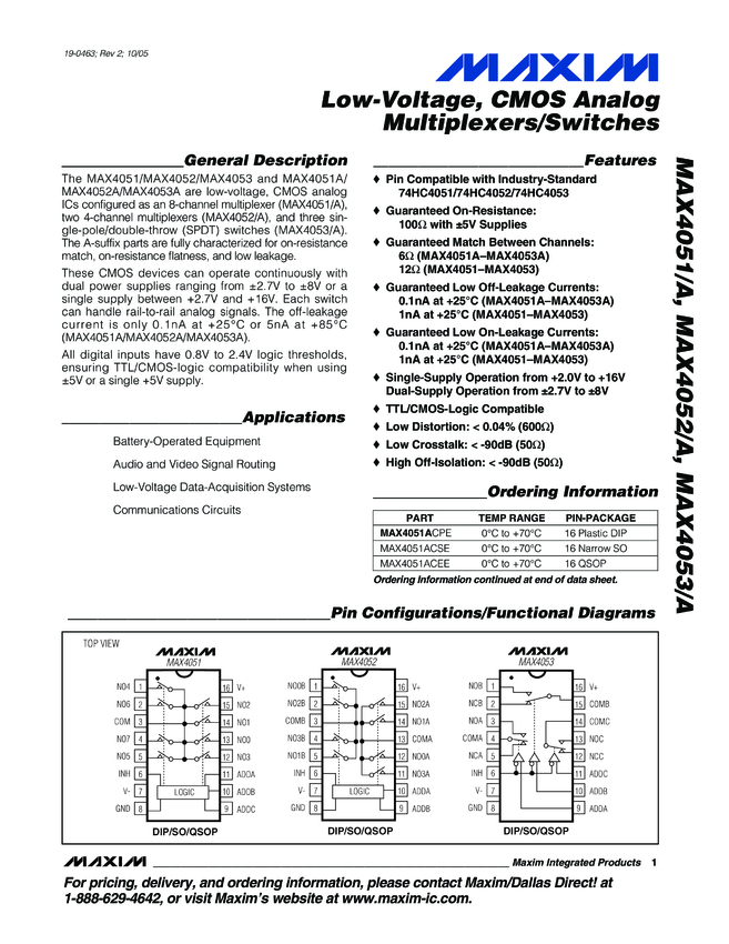 MAX4051, MAX4051A, MAX4052, MAX4052A, MAX4053, MAX4053A Low-Voltage, CMOS Analog Multiplexers/Switches