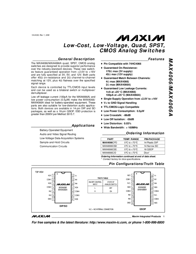 MAX4066, MAX4066A Low-Cost, Low-Voltage, Quad, SPST, CMOS Analog Switch