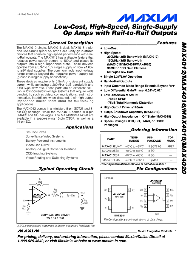 MAX4012, MAX4016, MAX4018, MAX4020 Low-Cost, High-Speed, Single-Supply Op Amps with Rail-to-Rail Outputs