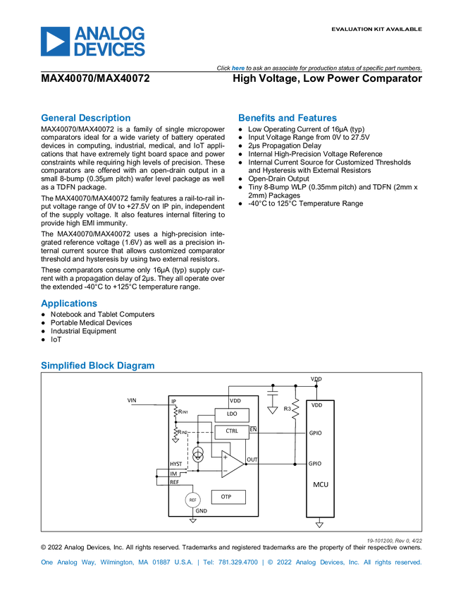 220ns, 12µA, 6-Bump WLP Comparators with Shutdown