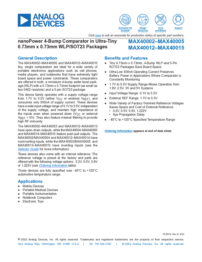 nanoPower 4-Bump Comparator in Ultra-Tiny 0.73mm x 0.73mm WLP/SOT23 Packages
