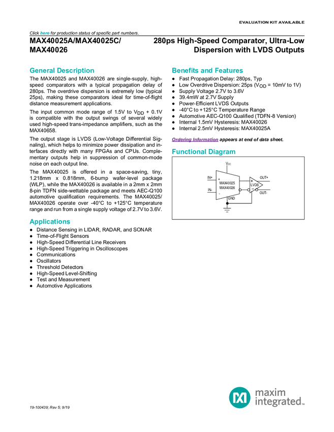 280ps High-Speed Comparator, Ultra-Low Dispersion with LVDS Outputs