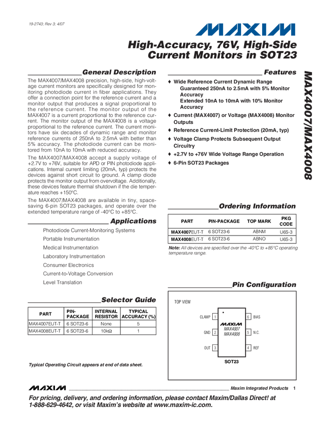 MAX4004, MAX4006 High-Accuracy, High-Side Current Monitors in SOT23