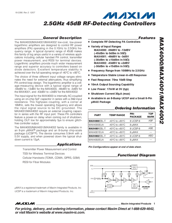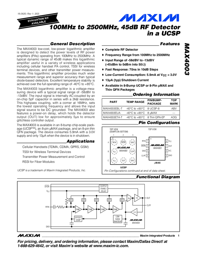 100MHz to 2500MHz, 45dB RF Detector in a UCSP