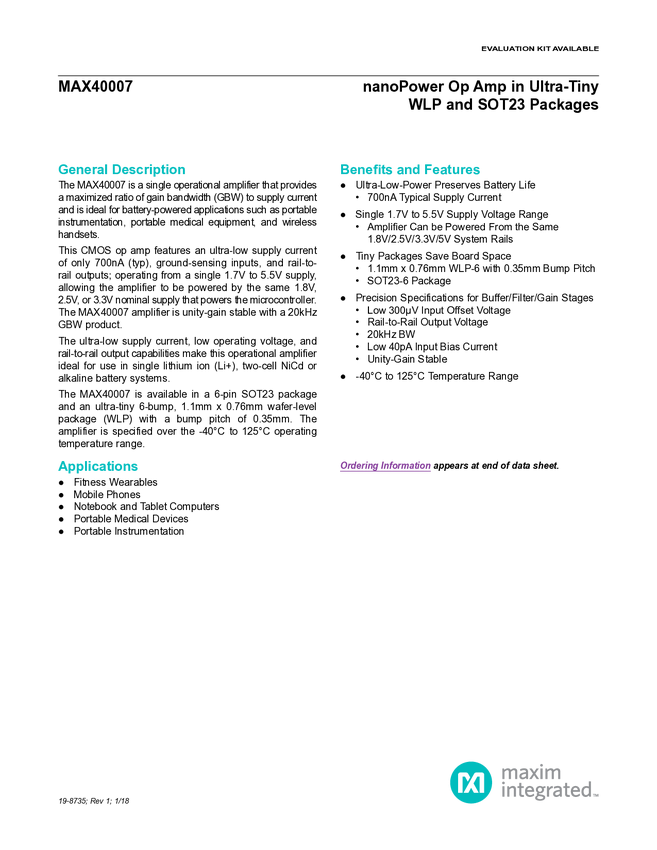nanoPower Op Amp in Ultra-Tiny WLP and SOT23 Packages