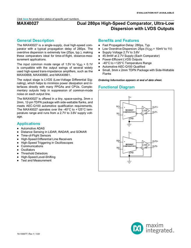 Dual 280ps High-Speed Comparator, Ultra-Low Dispersion with LVDS Outputs