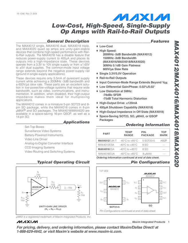 MAX4020 Quad, Low-Cost, High Speed, Single Supply Op Amp with Rail-to-Rail Outputs