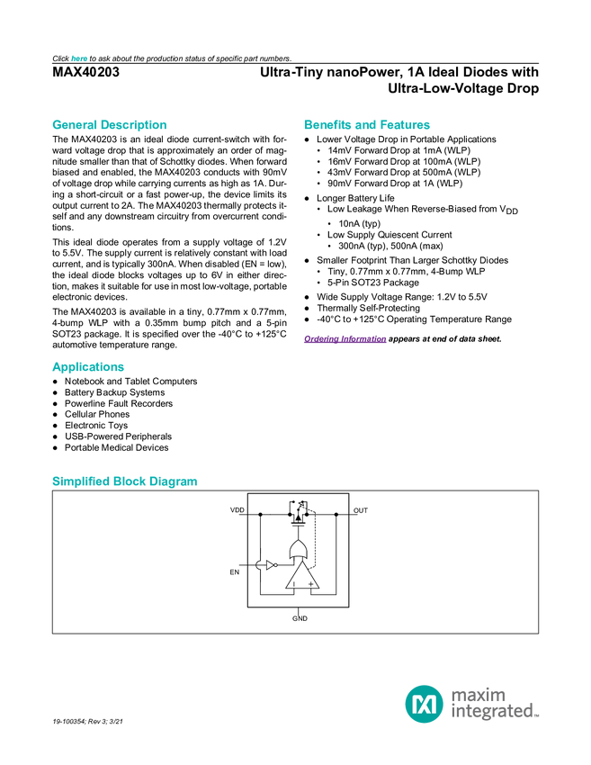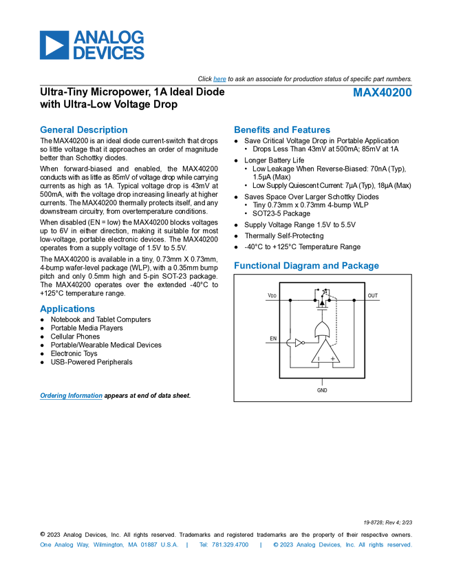 Ultra-Tiny Micropower, 1A Ideal Diode with Ultra-Low Voltage Drop