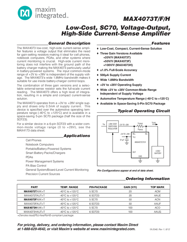 MAX4073F, MAX4073H, MAX4073T Low-Cost, SC70, Voltage-Output, High-Side Current-Sense Amplifier