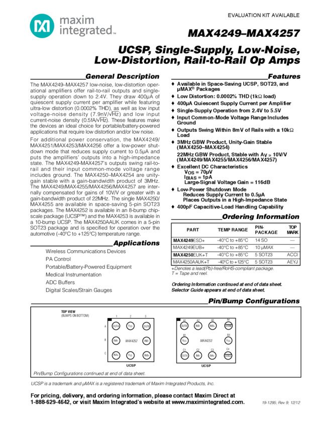 MAX4249, MAX4250, MAX4251, MAX4252, MAX4253, MAX4254, MAX4255, MAX4256, MAX4257 UCSP, Single-Supply, Low-Noise, Low-Distortion, Rail-to-Rail Op Amps