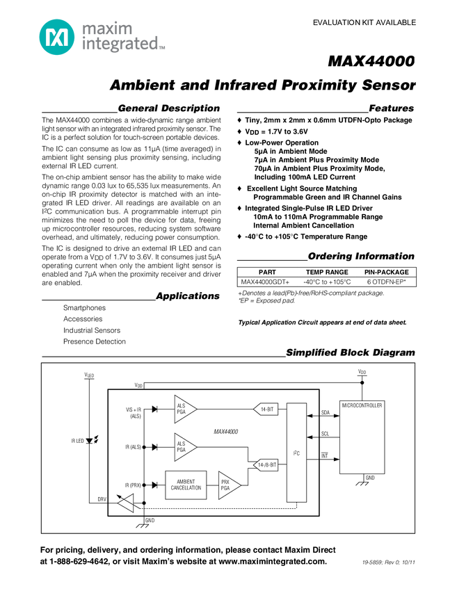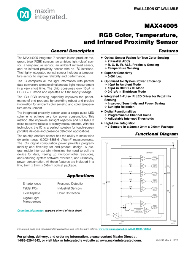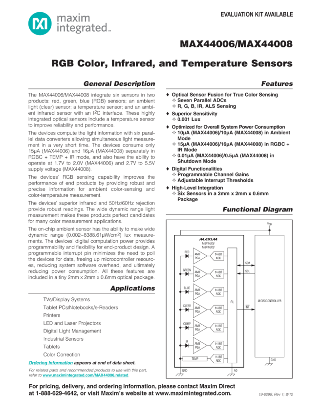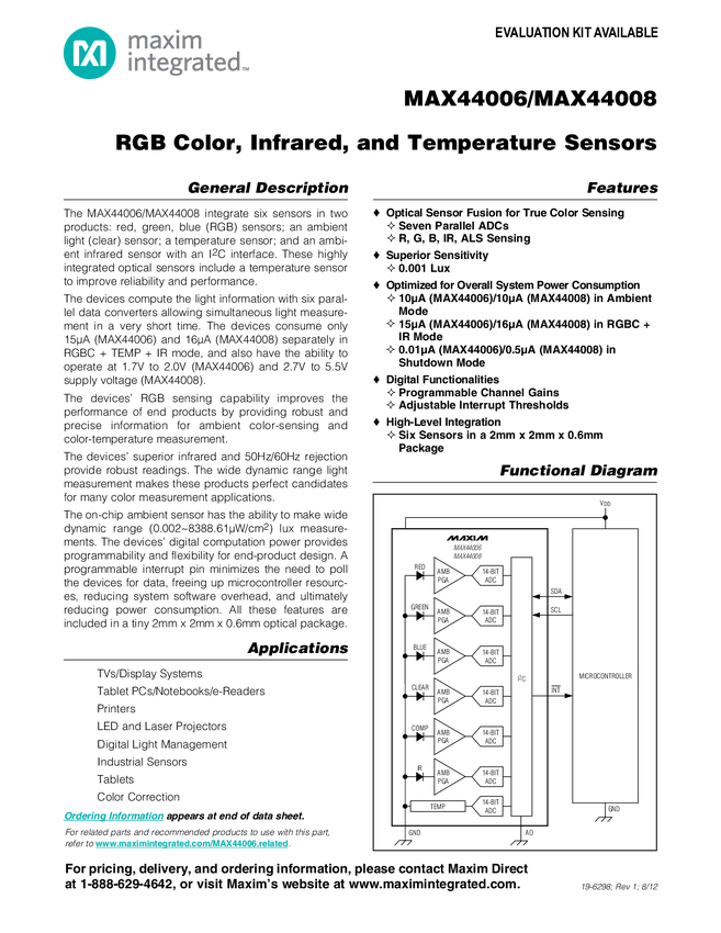 MAX44006, MAX44008 RGB Color, Infrared, and Temperature Sensors