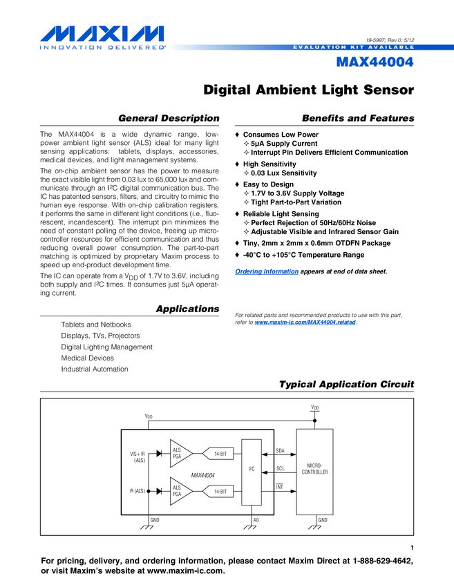 MAX44009 Industry's Lowest-Power Ambient Light Sensor with ADC
