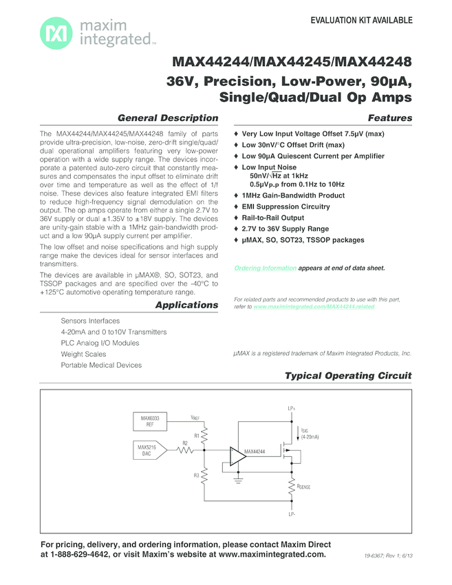 MAX44244, MAX44245, MAX44248 36V, Precision, Low-Power, 90µA, Single/Quad/Dual Op Amps