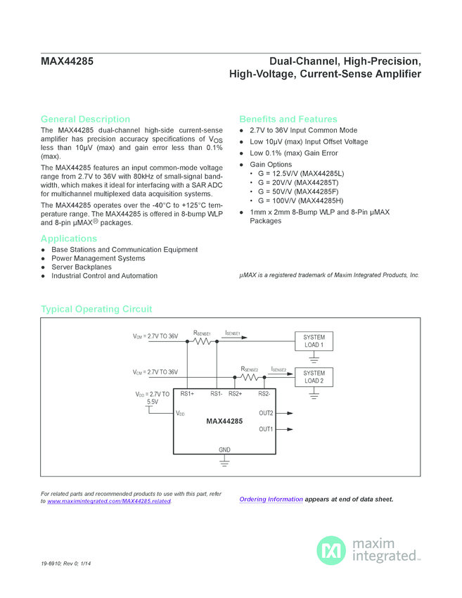 MAX44285 Dual-Channel, High-Precision, High-Voltage, Current-Sense Amplifier