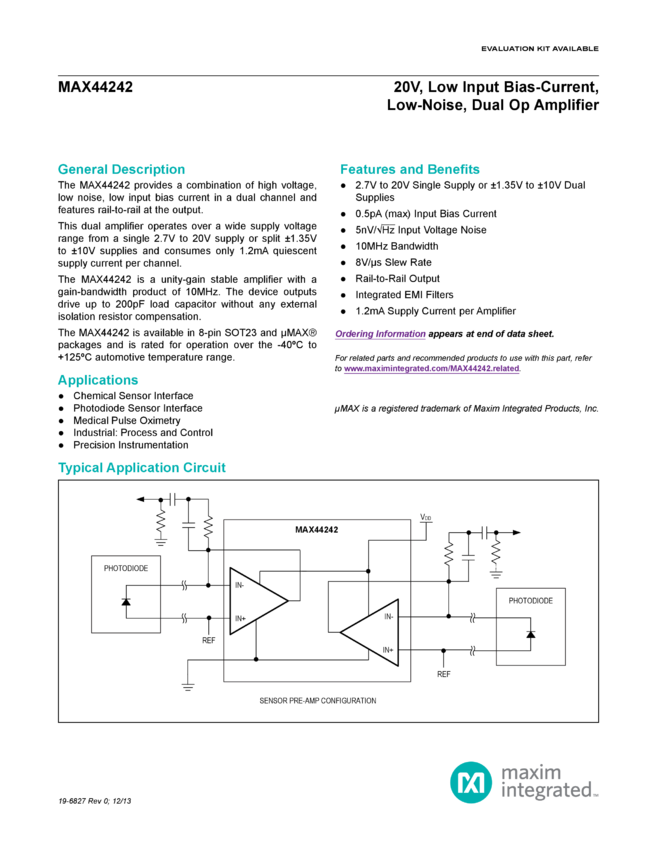 MAX44242 20V, Low Input Bias-Current, Low-Noise, Dual Op Amplifier