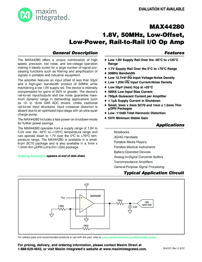 MAX44280 1.8V, 50MHz, Low-Offset, Low-Power, Rail-to-Rail I/O Op Amp