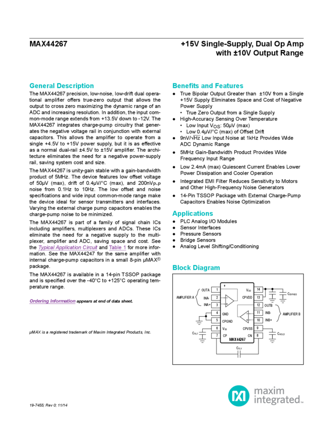 MAX44267 +15V Single-Supply Dual Op Amp with +/-10V Output Range