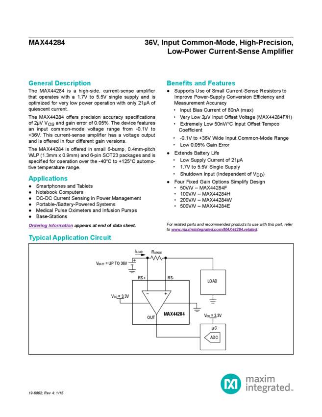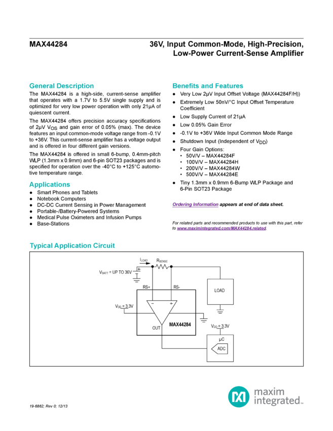 MAX44284 36V, Input Common-Mode, High-Precision, Low-Power Current-Sense Amplifier
