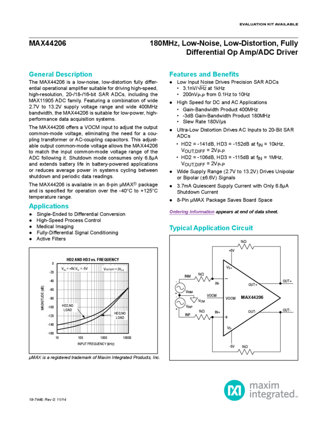 MAX44206 180MHz, Low-Noise Fully Differential Op Amp/SAR ADC Driver