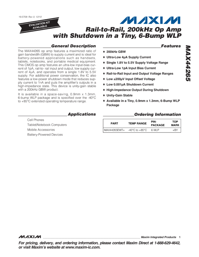 MAX44265 Rail-to-Rail, 200kHz Op Amp with Shutdown in a Tiny, 6-Bump WLP